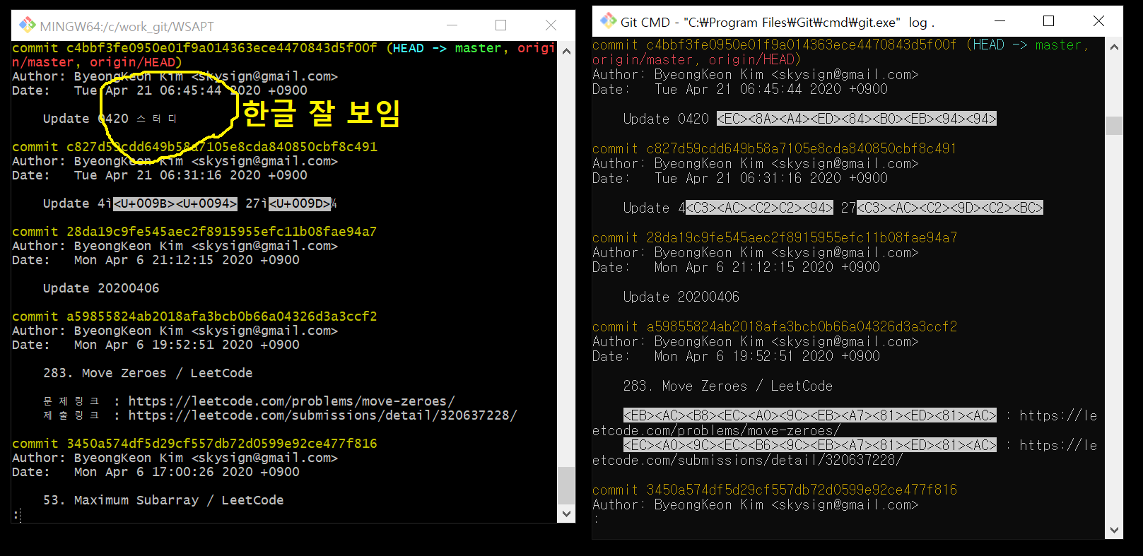 Git Bash 한글 잘 보임 vs Git CMD 한글 깨짐